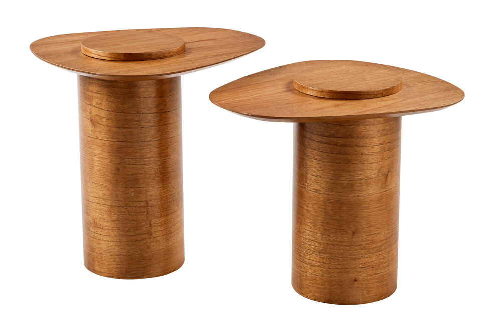 The Alva side tables were designed as support elements that make an assertive and elegant addition to any space. A design that combines the bold geometric form of the wooden base with the curved, asymmetrical contours of the tops. Available in two heights, they're ideal for placement in the middle of a room or beside a sofa.