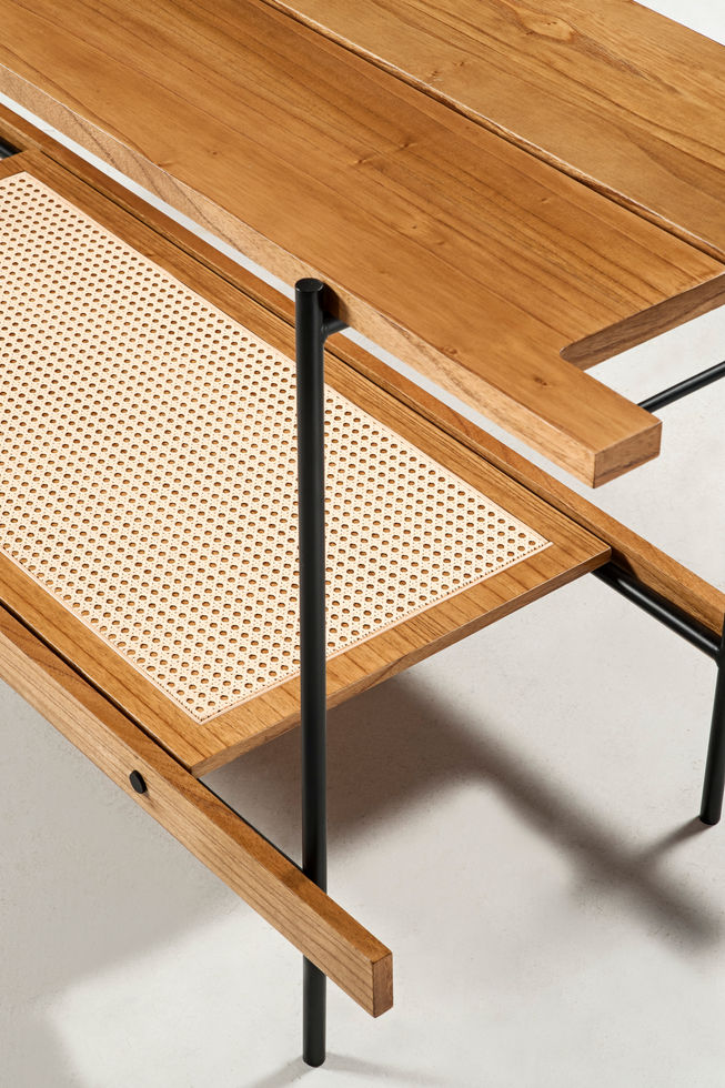 Even embodies characteristics that prioritize simplicity and functionality. With a clean and objective appearance, it promotes well-being, warmth, and affection, fostering a satisfying relationship through its finishes and combination of materials—such as straw, wood, and metal—along with its linearity and the precision of rich details, cuts, and joints that highlight and make the furniture welcoming and comfortable. Metal frame with tops made of MDF covered in natural cinnamon wood veneer.